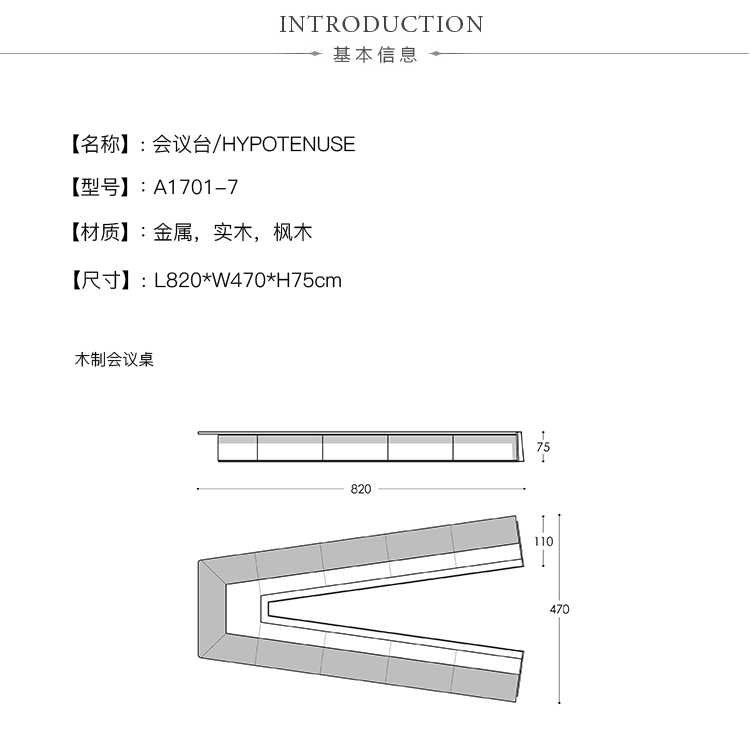 会议桌。50mm厚的直线顶部,在桌子内侧打开。顶部分为两部分,允许不同材料和饰面的组合。表专门设计用于集成可伸缩电脑显示器,电缆管理和电子系统的其他部分。底座由隐藏的金属结构组成,桌面内侧采用FIXED INCLINED面板封闭,外侧采用可拆卸面板,可方便地进入桌面内部,以便进行电缆管理和维护。表面处理:混合成品顶部采用木材,微纹理漆或Techno Leather软垫。固定面板,木质或漆面。