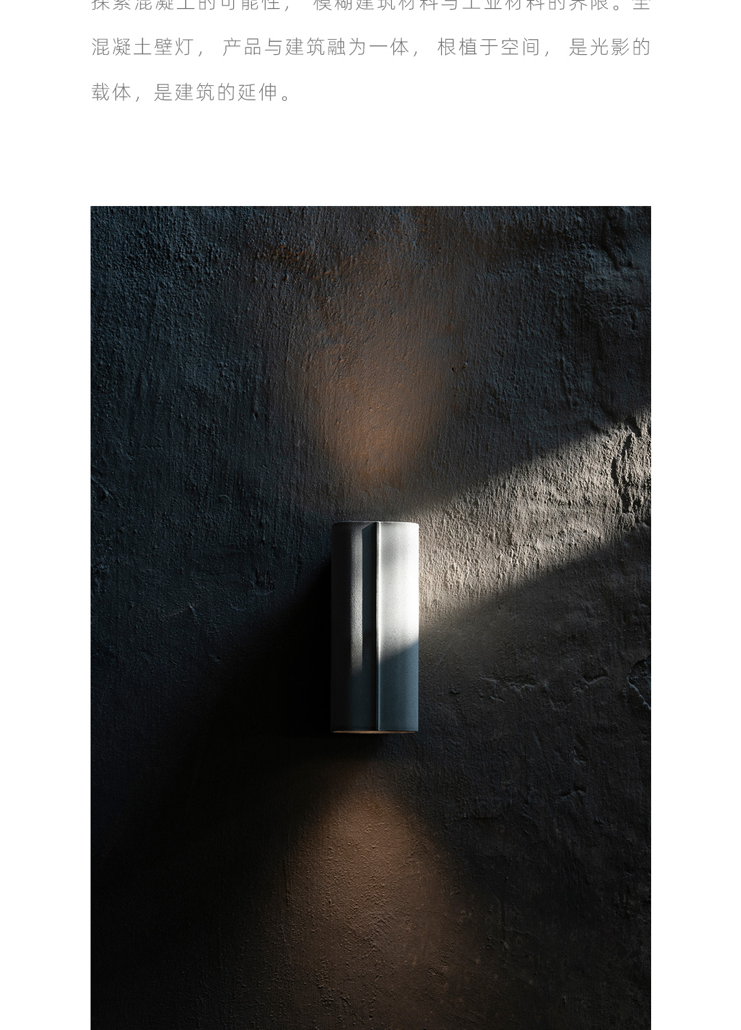 探索混凝土的可能性,模糊建筑材料与工业材料的界限。全混凝土壁灯,产品与建筑融为一体,根植于空间,是光影的载体,是建筑的延伸。