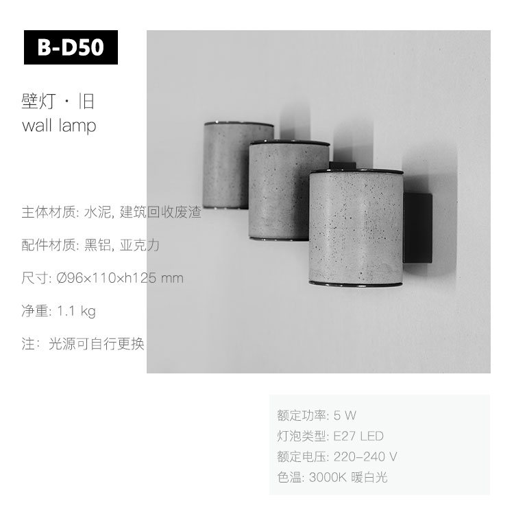 圆柱形的水泥,力的支撑,也是光的支撑。而支撑它的,是一块色彩。又或许,是它支撑色彩。 回归自然而纯粹,对水泥这一建筑建造领域的传统材料重新审视。水泥本是建筑上的材料,将它用在灯饰上,赋予它新的用途。 水泥给人的视觉感受是别的材料无法替代的,它极致纯粹,孔洞肌理独有美感。 而水泥的天然、无需再外加装饰的节能环保,使“旧”在耐用之余,更贴合我们一向秉承回归自然的追求。