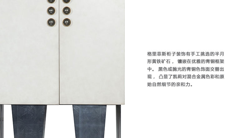 格里菲斯柜子装饰有手工挑选的半月形黄铁矿石,镶嵌在优雅的青铜框架中。 黑色或抛光的青铜色饰面交替出现,凸显了凯莉对混合金属色彩和原始自然细节的亲和力。 钢底座,羊皮纸外包装和天然胡桃木内部抽屉。