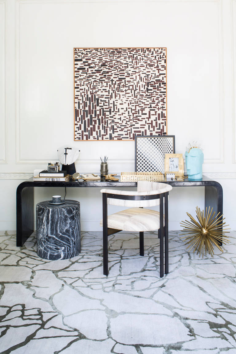 从石头和大理石的天然纹理中汲取灵感,当光线照射到丝线上时,Tracery地毯有机线条的变化和闪烁。 背景是西藏羊毛,呈暖灰色,图案为柔软的橄榄绿色丝绸。