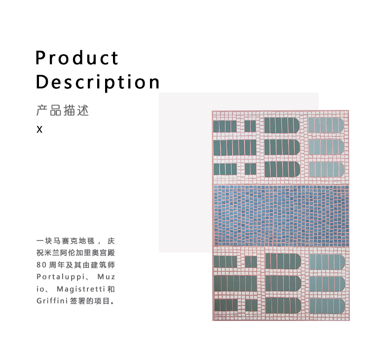 一块马赛克地毯,庆祝米兰阿伦加里奥宫殿80周年及其由建筑师Portaluppi、Muzio、Magistretti和Griffini签署的项目。 在建筑立面上再现不对称几何形状的相同大理石砖被投射在非织造织物上。