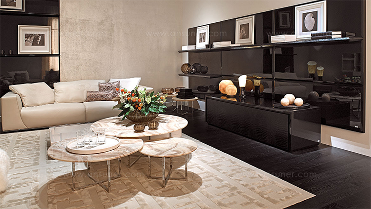 Olimpic, a contemporary coffee table set is available in 4 shapes; round, square, rectangle, oval. The Olimpic also offers 4 finishes; liquid bronze, chameleon bronze, onyx bronze and gris pulpis marble, each of them have different touches. All items can be paired perfectly.