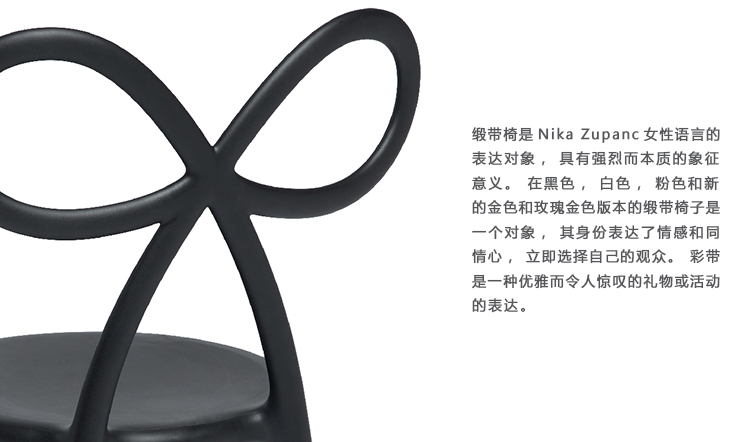 缎带椅是Nika Zupanc女性语言的表达对象,具有强烈而本质的象征意义。在黑色,白色,粉色和新的金色和玫瑰金色版本的缎带椅子是一个对象,其身份表达了情感和同情心,立即选择自己的观众。彩带是一种优雅而令人惊叹的礼物或活动的表达。