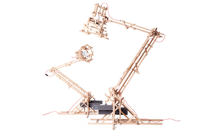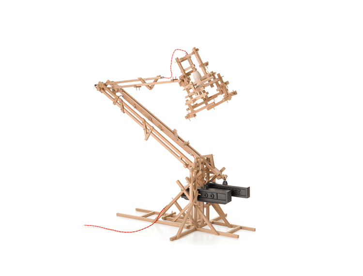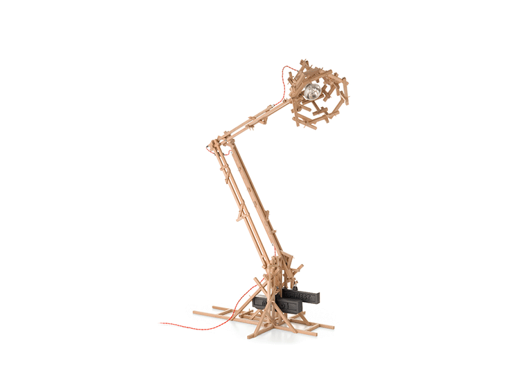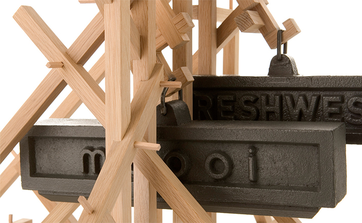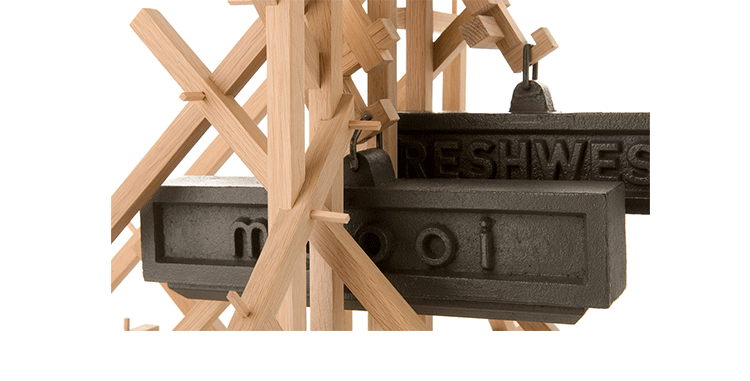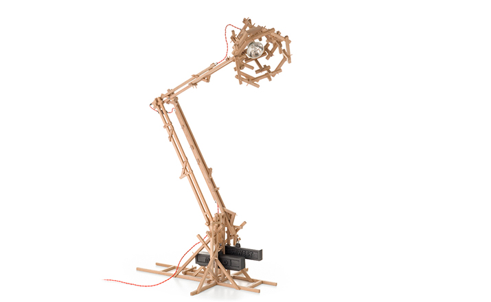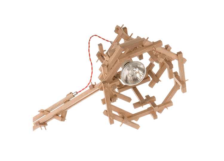 "in a brave new world imagination is free to produce a complex lamp with simple materials, translating the warm soul of the oak wood in a mechanic way.""the brave new world lamp by design duo fresh west started as a concept piece of random thought-initiated construction. Following the example of old far eastern bamboo scaffolding or simply of our childhood meccano creations, the brave new world lamp was developed without a design or plan in place. Nevertheless each piece of wood is carefully notched and pegged together to form an integral part of the overall mechanical structure." Material: Oak frame and cast iron balancing weights"