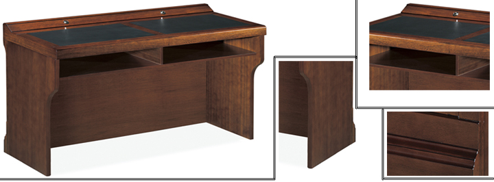 ※  全木制结构条形桌,桌脚可做直形及弧形,下设空格储物空间,内嵌式皮垫写字板,麦克孔,满足不同需要;