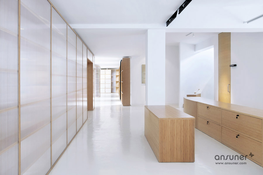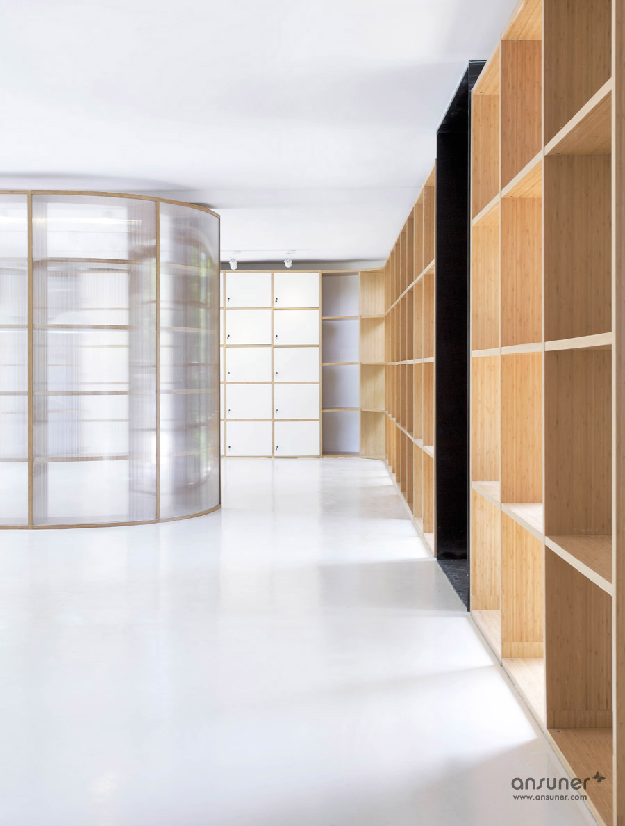 该办公室内装设计项目位于浙江省杭州,虽然基地拥有良好的室外自然景观条件,但原有建筑内部阴暗压抑:已有结构的1层层高3.3m ,梁下高度2.6m, 空间比例相对低矮;2层空间的高度具有优势,但1,2层的联系较弱,原有建筑的双层特点也并没有展现出来。